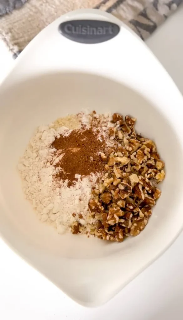 In a separate large mixing bowl, combine almond flour, coconut flour, baking soda, baking powder, cinnamon, chopped walnuts, and salt. Mix until well combined.