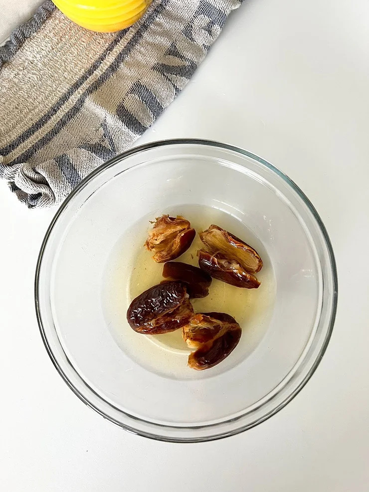 - In a glass bowl, cover pitted Medjool dates with boiling water. Soak for 15 minutes.