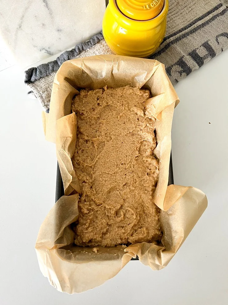 - Line a bread loaf pan with parchment paper. Grease with coconut oil. Set aside.